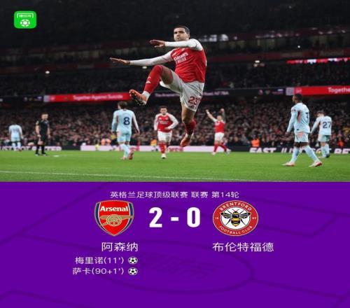 剑南春阿森纳20布伦特福德,梅里诺传射,萨卡建功